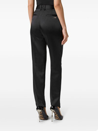 tailored satin trousers Highlights - Black - Satin finish - Stretch-design - Pleat detailing - Silver-tone logo plaque - High-waisted - Concealed front fastening - Belt loops - Tailored cut - Two side slit pockets - Two rear welt pockets Made in Italy Composition Lining: Polyester 100% Outer: Polyester 96%, Elastane 4%