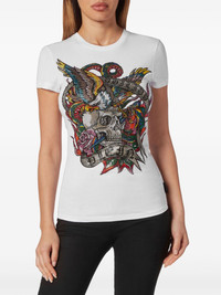 tattoo-embellished T-shirt Highlights - White - Stretch-design - Applique logo - Rhinestone embellishment - Round neck - Short sleeves - Straight hem Imported Composition Glass Fiber 100%, Cotton 100%