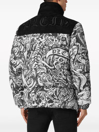 tattoo-print puffer jacket Showing Philipp Plein's creative and bold aesthetic, this puffer jacket features a black and white design enhanced with a tattoo-style print panel. Plein's logo appears embroidered at the rear for a discreet branded touch. Highlights - White/black - Leather - Padded design - Embroidered logo to the rear - Tattoo print - High neck - Front zip fastening - Two diagonal pockets to the sides - Long sleeves - Straight hem - Applique logo Imported Composition Leather 100%, Nylon 100%