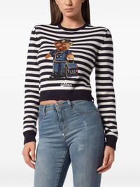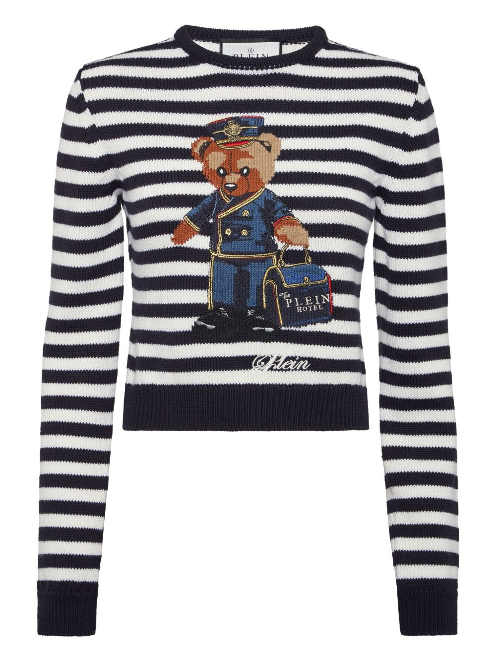 teddy bear-jacquard jumper Highlights - Navy blue - Horizontal stripe pattern - Embroidered logo - Long sleeves - Cropped Made in Italy Composition Fabric 100% Washing instructions Read Manufacturer Guidelines