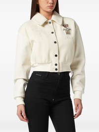 teddy-embellished leather bomber jacket Highlights - Off-white - Leather sleeves - Embroidered lettering - Teddy bear applique - Crystal embellishments - Button fastening Made in Italy Composition Lining: Polyester 97%, Elastane 3% Outer: Polyester 100%, Calf Leather 100% Washing instructions Read Manufacturer Guidelines