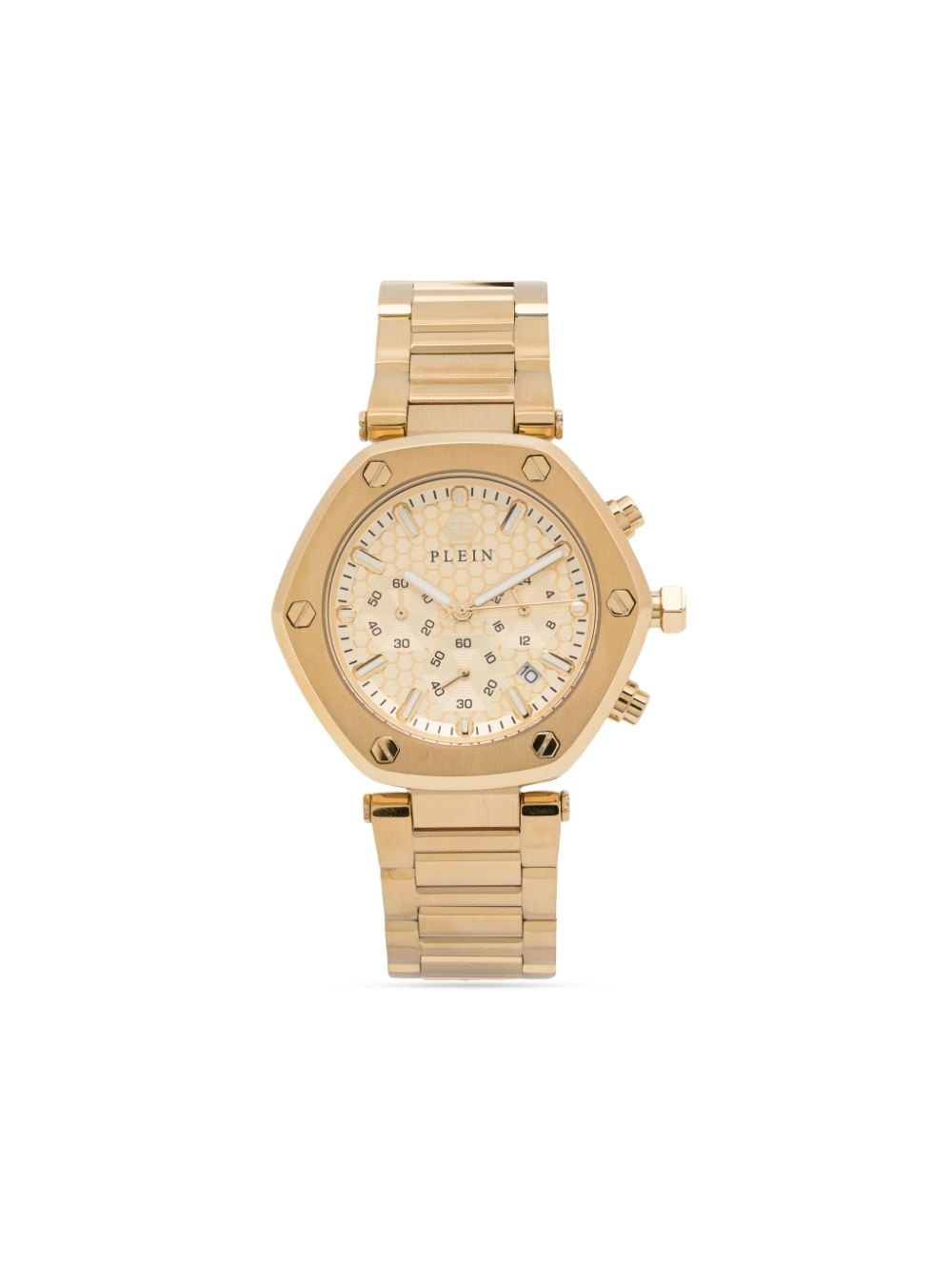 The Hexagon 42mm The Hexagon 42mm from Philipp Plein offers style and functionality in equal measure. It's crafted with a gold-tone hexagonal stainless steel case with a matching-hued honeycomb-patterned dial that exhibits chronograph counters and luminous accents, ideal in low-light conditions. Highlights - 42mm - Gold-tone - Stainless steel case - Stainless steel link bracelet - Mineral glass - Honeycomb pattern dial - Index dial - Index hands - Hexagonal face - Chronograph counters - Two chronograph pushers - Screw-down crown - Butterfly clasp fastening - Quartz movement - This item comes with a standard two-year warranty from the brand. Imported Composition glass 100%, stainless steel 100% SIZE & FIT Model measurements Height 6 ft 2 in(1.87 m) Bust/Chest 36.41 in(92.5 cm) Hips 35.43 in(90 cm) Waist 29.52 in(75 cm) Measurement CIRCUMFERENCE 0.82 in(2.1 cm) DIAMETER 0.17 in(0.4 cm) Thickness 0.04 in(0.1 cm) WIDTH 0.09 in(0.2 cm)
