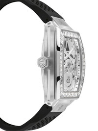 The $keleton 44mm Highlights - 44mm - Silver-tone - Stainless steel - Tonneau face - Skeleton dial - Guilloche dial - Baton hands - Central hours, minutes and seconds - Screw-down crown - Skeleton case back - Rubber strap - Pin-buckle fastening - Automatic movement - This item comes with a standard one-year warranty from the brand. Imported Composition stainless steel 100%, Rubber 100%, Crystal 100% SIZE & FIT Measurement DIAMETER 1.73 in(4.4 cm)