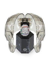 The Skeleton 44mm Philipp Plein's iconic Skeleton collection began as a sneaker line, with key elements translating into the world of fine watchmaking. A case in point, this 44mm timepiece is powered by automatic movement and features an intricate transparent dial that spotlights the inner mechanism. It's outlined with colourful crystal embellishments in a nod to the brand's statement aesthetic. Highlights - 44mm - Silver-tone - Stainless steel - Tonneau face - Skeleton dial - Guilloche dial - Crystal index - Baton hands - Central hours, minutes and seconds - Crystal-encrusted bezel - Screw-down crown - Skeleton case back - Black - Rubber strap - Pin-buckle fastening - Automatic movement - Water resistance up to 50m/5 atm - This item comes with a standard one-year warranty from the brand. Made in Italy Composition stainless steel 100%, Mineral Glass 100%, Silicone 100%