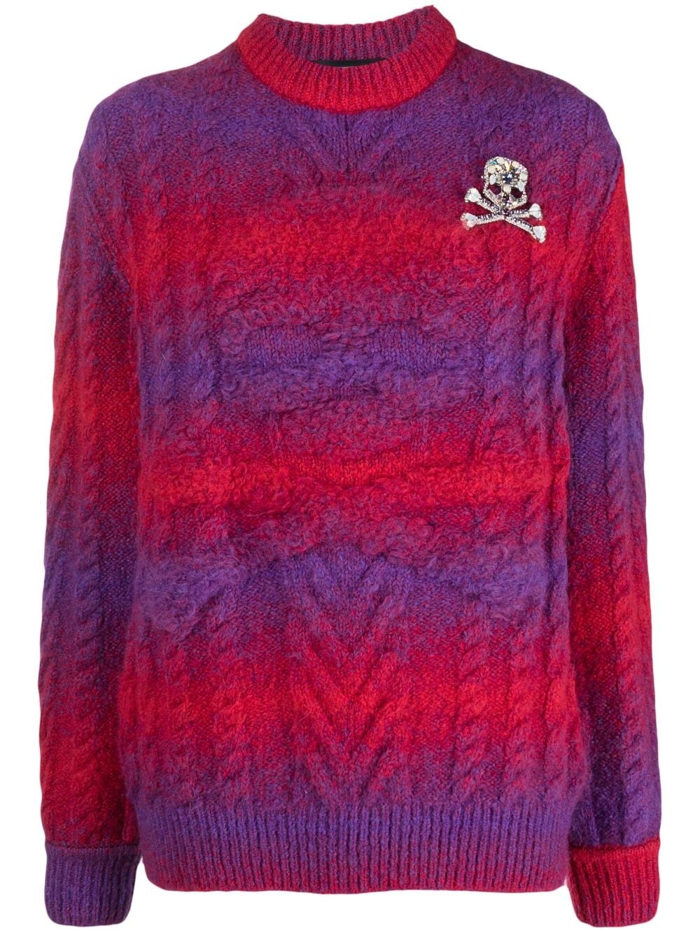 two-tone knitted jumper Highlights - Bright red/violet purple - Alpaca wool-blend - Knitted construction - Chunky cable knit - Brooch detail - Crew neck - Long sleeves - Ribbed cuffs and hem Made in Italy Composition Alpaca Wool 63%, Polyamide 37% Washing instructions Machine Wash
