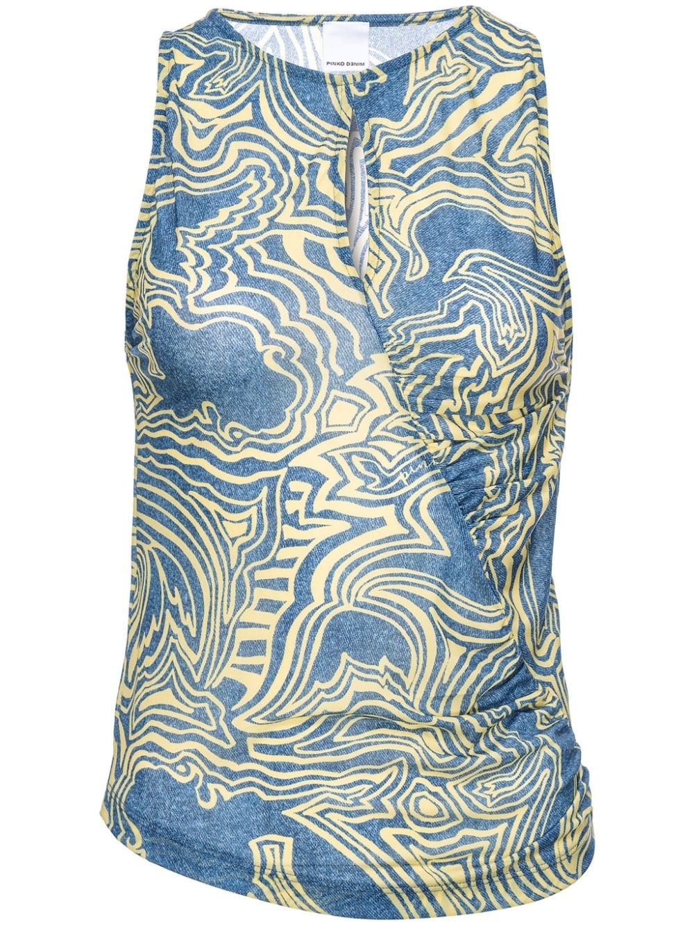 abstract-print ruched tank top Highlights - Citrin pale yellow/denim blue - Abstract pattern print - Ruched detailing - Cut-out detailing - Round neck - Sleeveless - Asymmetric hem Imported Composition Polyamide 90%, Spandex/Elastane 10%