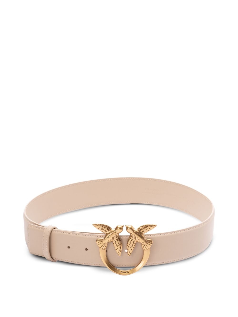 buckle leather belt Highlights - Beige - Signature love birds buckle - Punched holes - Adjustable fit Imported Composition Zinc 100%, Calf Leather 100% SIZE & FIT Measurement TOTAL LENGTH 39.76 in(101 cm) WIDTH 1.57 in(4 cm)