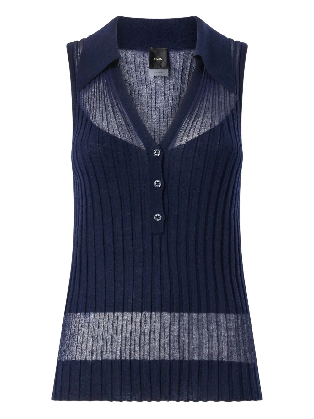 buttoned ribbed polo top Highlights - Iris blue - Ribbed knit - Button fastening - Collared - Sleeveless - Sheer panels Imported Composition Wool 80%, Silk 10%, Cashmere 10% Washing instructions Hand Wash