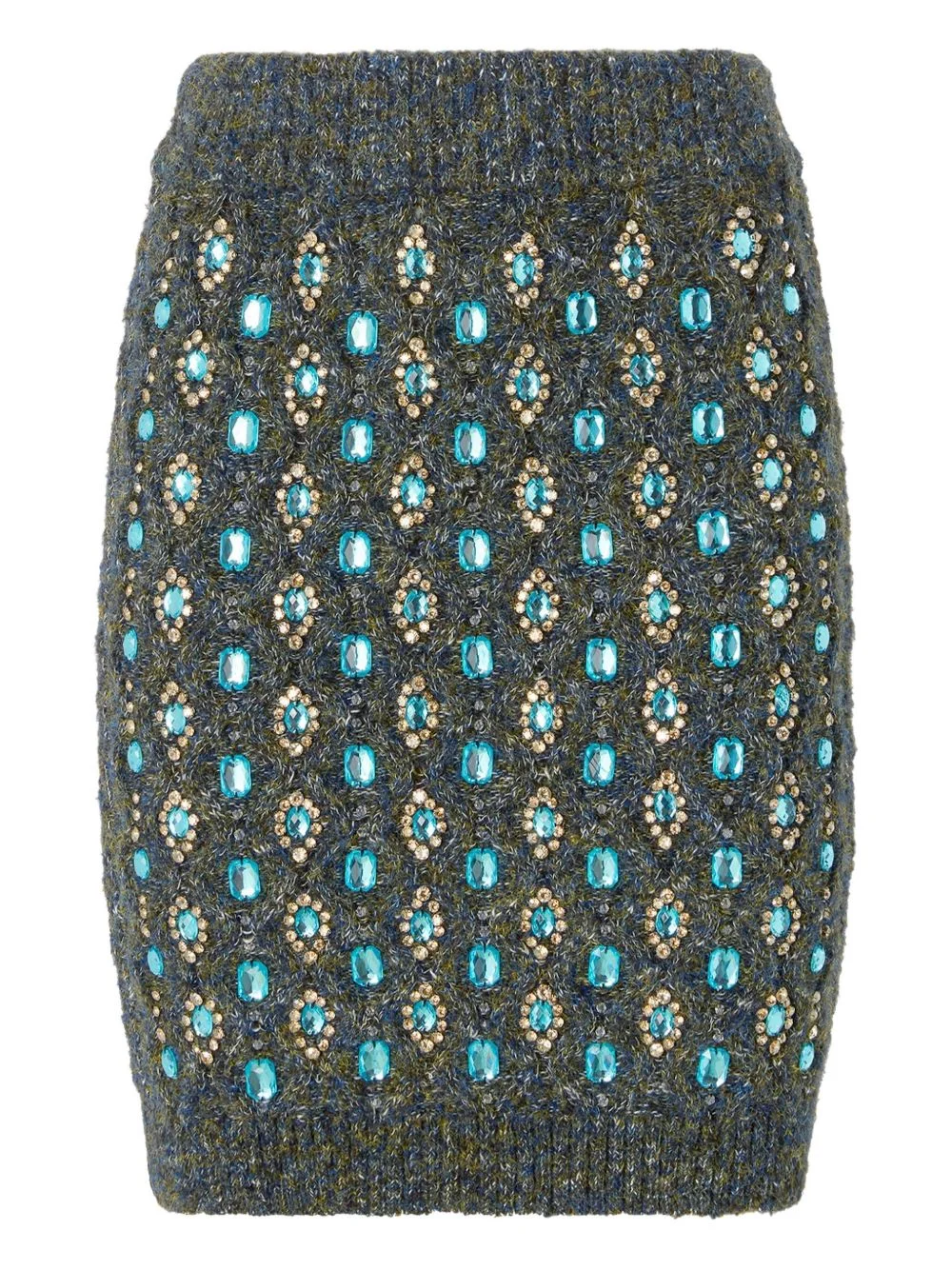 cable-knit embellished mini skirt Highlights - Grey blue green - Cable knit - Stone embellishment - High waist - Straight hem Imported Composition Polyester 85%, Acrylic 13%, Elastane 2% Washing instructions Read Manufacturer Guidelines