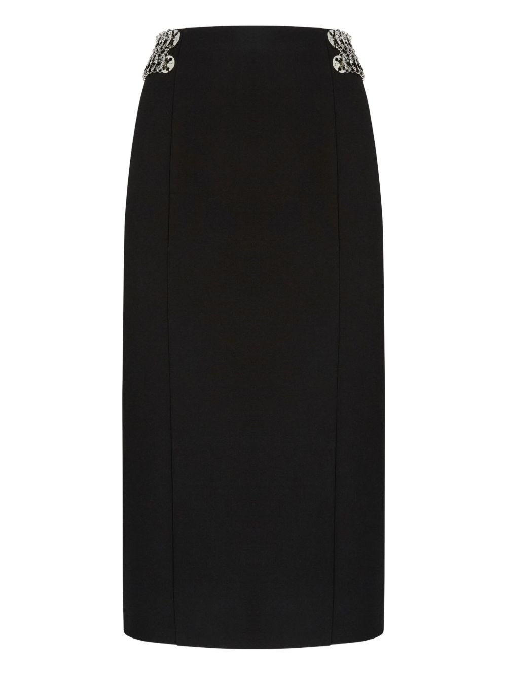 chain-embellished pencil skirt Highlights - Black - Chain embellishment - Straight hem - Mid-length Imported Composition Polyester 78%, Viscose 18%, Elastane 4% Washing instructions Read Manufacturer Guidelines