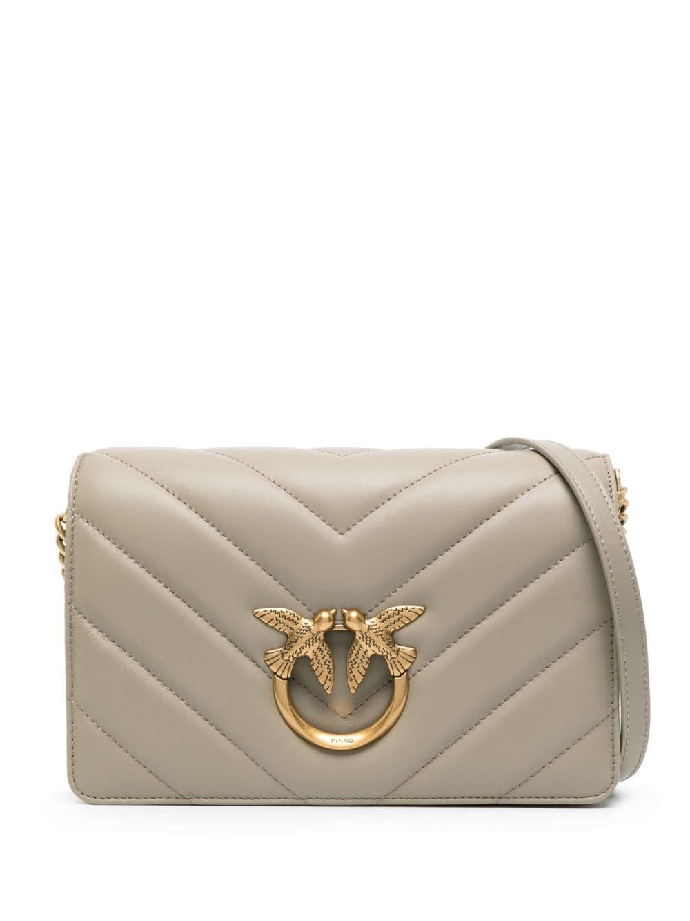 Classic Love leather shoulder bag PINKO's Classic Love shoulder bag is crafted from muted sage green leather to a quilted square silhouette that allows the iconic Love Birds plaque at the front to take centre stage. Highlights - Desert sage green - Calf leather - Quilted - Gold-tone hardware - Signature love birds buckle - Foldover top with magnetic fastening - Leather and chain-link shoulder strap - Partitioned compartment - Internal zip-fastening pocket - Internal slip pocket Made in Italy Composition Outer: Calf Leather 100% Lining: Calf Leather 100% SIZE & FIT Model measurements Height 5 ft 9 in(1.75 m) Bust/Chest 31.49 in(80 cm) Hips 34.05 in(86.5 cm) Waist 24.21 in(61.5 cm) Measurement DEPTH 3.14 in(8 cm) HEIGHT 6.69 in(17 cm) STRAP 20.86 in(53 cm) WIDTH 9.84 in(25 cm)