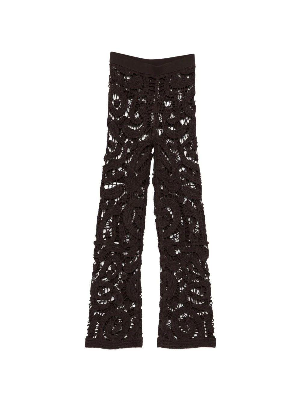 crochet trousers Highlights - Brown - Crochet knit - Elasticated waistband Imported Composition Viscose 63%, Nylon 37% Washing instructions Read Manufacturer Guidelines