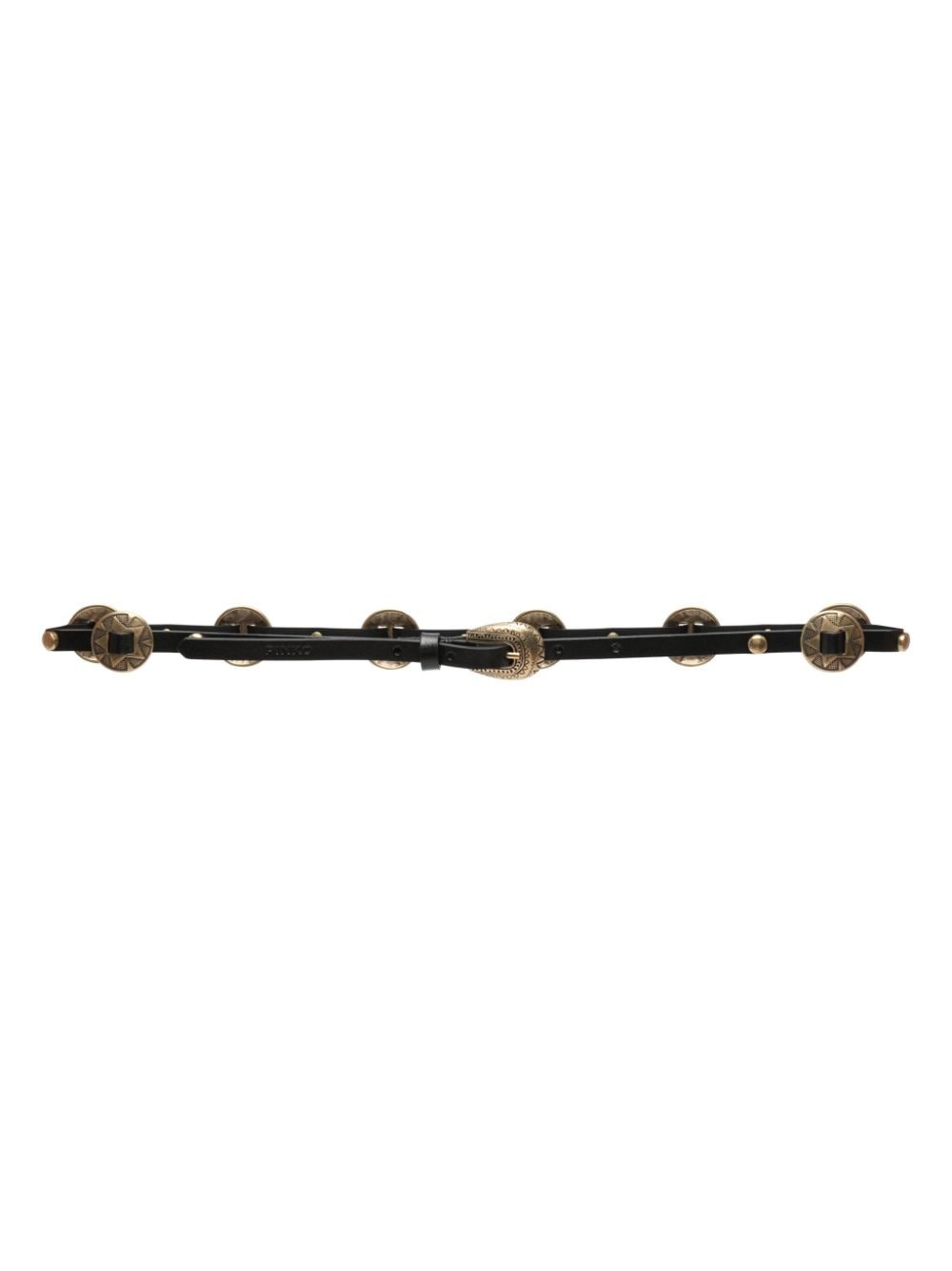 decorative-buckles belt Highlights - Black - Calf leather - Thin strap - Decorative buckles embellishment - Stud embellishment - Engraved detail to the hardware - Punched holes - Antique-effect hardware - Pin-buckle fastening - Adjustable fit - This piece comes complete with a protective dust bag. Imported Composition Calf Leather 100%, Metal 100% SIZE & FIT Measurement Maximum Length 33.46 in(85 cm) Minimum Length 29.52 in(75 cm) WIDTH 0.39 in(1 cm)