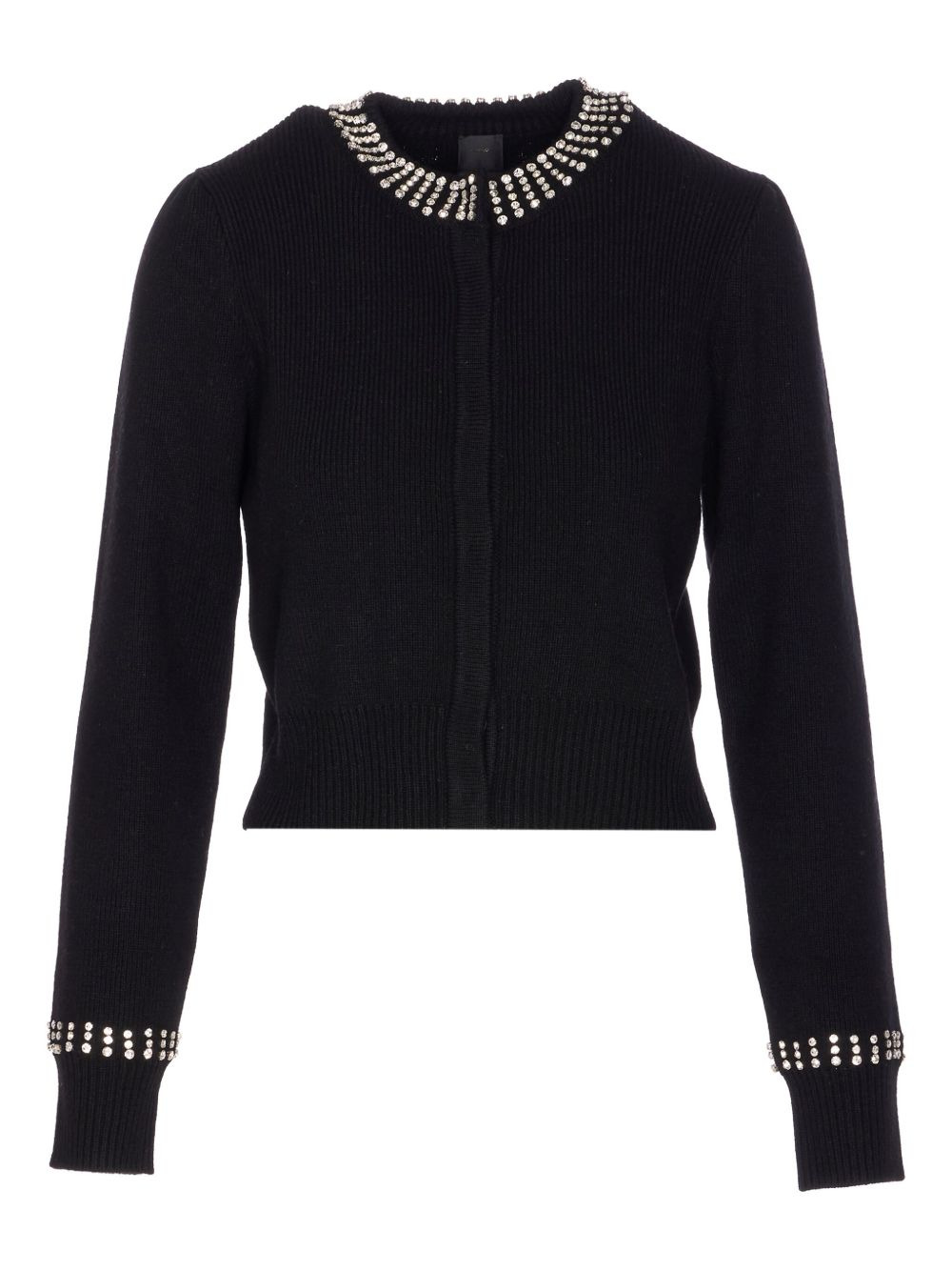 embellished cardigan Highlights - Black - Embellished neck and sleeves - Ribbed knit - Long sleeves - Button front Imported Composition Nylon 48%, Viscose 27%, Wool 20%, Cashmere 5% Washing instructions Read Manufacturer Guidelines