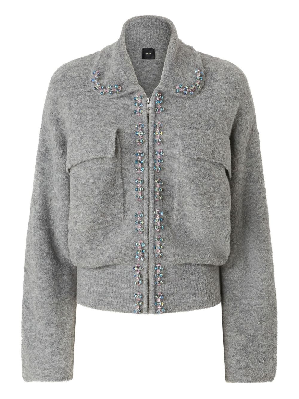 embellished jacket Highlights - Monument grey - Embellishment - Point collar - Front pockets - Zip fastening - Long sleeves Imported Composition Acrylic Resin 100%, Acrylic 46%, Polyester 20%, Polyamide 18%, Wool 15%, Elastane 1% Washing instructions Hand Wash