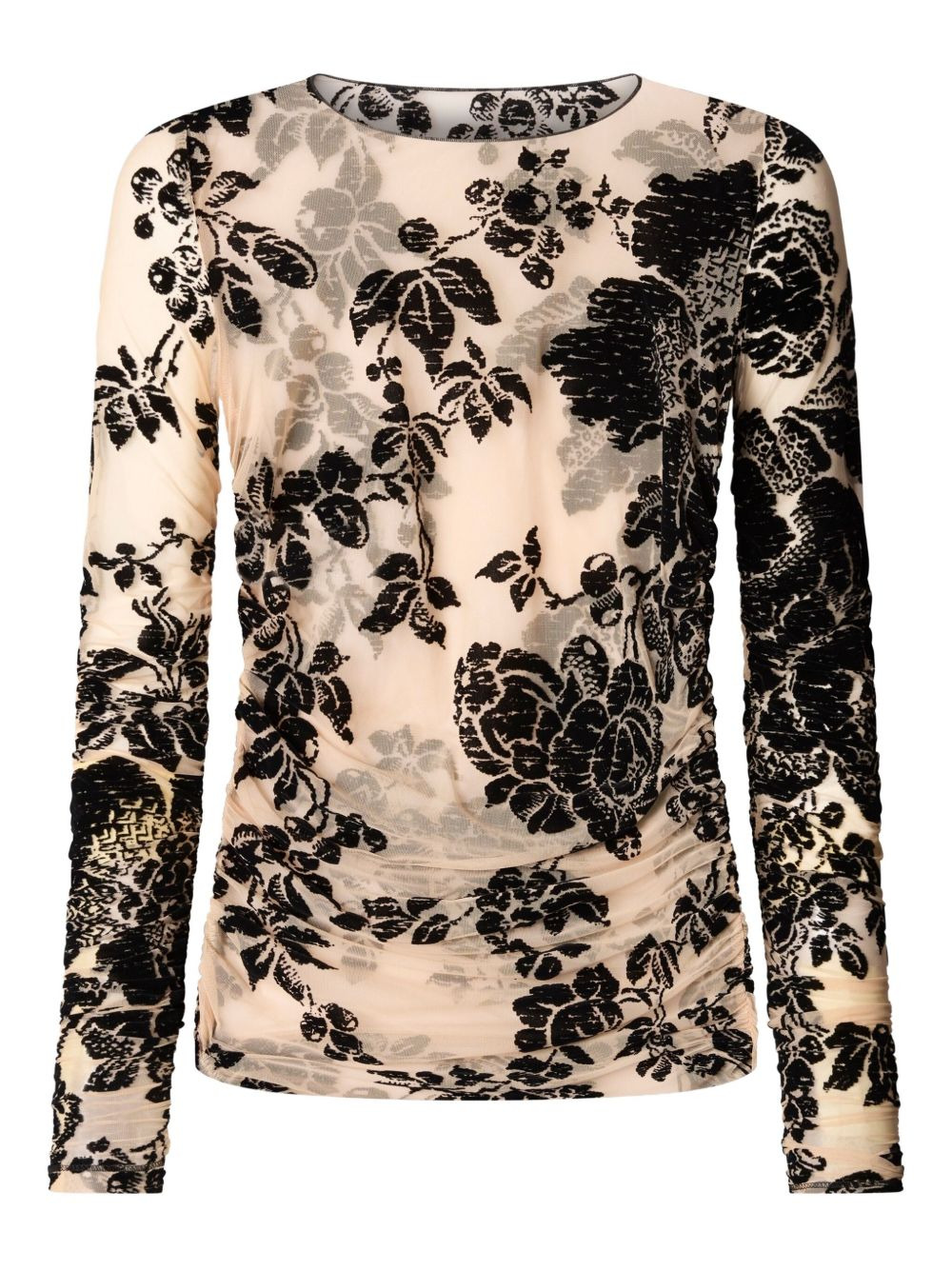 floral-velvet mesh top Highlights - Beige - Floral pattern - Long sleeves - Round neck Imported Composition Polyamide 85%, Elastane 15% Washing instructions Read Manufacturer Guidelines