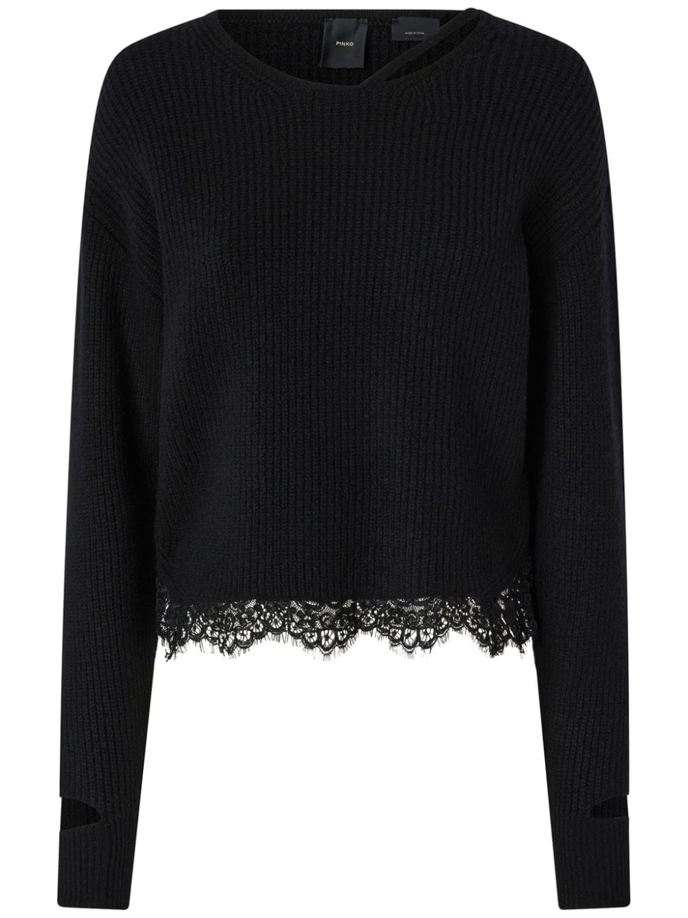 lace-trim sweater Highlights - Black - Wool blend - Ribbed knit - Asymmetric neck - Lace trim - Long sleeves - Ribbed cuffs - High-low hem Imported Composition Outer: Elastane 1% Wool 74%, Polyamide 25% SIZE & FIT FittingInformation Designed for a relaxed fit, this piece allows for comfort and movement when worn Made with a midweight knit, this piece offers some stretch Washing instructions Hand Wash