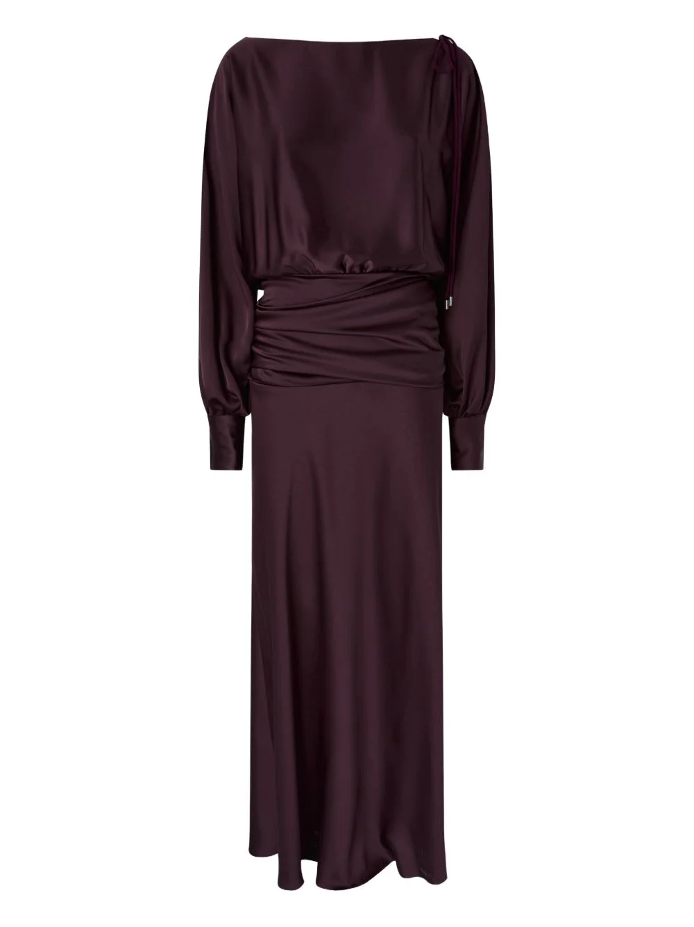 long-sleeve ruched-detail dress Highlights - Burgundy - Long sleeve - Ruched detail - Tie detail - Midi length Made in Italy Composition Outer: Triacetate 91%, Viscose 87%, Nylon 13%, Polyester 9% Lining: Triacetate 67%, Polyester 33% Washing instructions Do Not Wash/Do Not Dry Clean