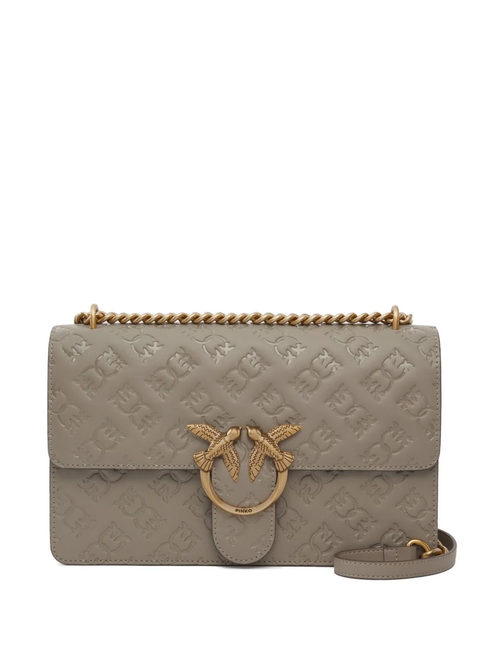 Love Birds debossed leather cross body bag Highlights - Taupe - Debossed pattern - Love birds clasp - Chain strap - Flap closure - Leather body Imported Composition Outer: Bovine Leather 100% SIZE & FIT Measurement DEPTH 2.36 in(6 cm) HEIGHT 6.29 in(16 cm) WIDTH 10.62 in(27 cm) Washing instructions Do Not Wash/Do Not Dry Clean