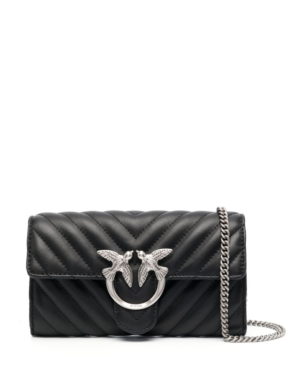 Love One quilted wallet-on-chain Highlights - Black - Calf leather - Chevron quilting - Signature love birds buckle - Silver-tone hardware - Foldover top with magnetic fastening - Partitioned compartment - Internal card slots - Internal zip-fastening pocket - Chain-link shoulder strap Imported Composition Outer: Calf Leather 100% SIZE & FIT Model measurements Height 5 ft 8 in(1.73 m) Bust/Chest 33.07 in(84 cm) Hips 35.03 in(89 cm) Waist 24.8 in(63 cm) Measurement DEPTH 1.18 in(3 cm) HEIGHT 3.93 in(10 cm) STRAP 20.86 in(53 cm) WIDTH 7.48 in(19 cm)