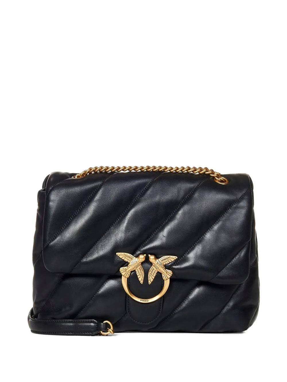 Love Puff shoulder bag PINKO's signature bag silhouette, the Love, is defined by the large Love Bird buckle on the front. The brand's iconic motif stands as a symbol of 'love and freedom, strength and light' that define the label's aesthetic. Highlights - Black - Quilted - Signature love birds clasp - Chain-link shoulder strap - Front flap closure Imported Composition Lining: Nylon 50%, Polyester 50% Trims: Zamak 100% Outer: Leather 100% SIZE & FIT Measurement DEPTH 4.33 in(11 cm) HEIGHT 9.05 in(23 cm) WIDTH 12.59 in(32 cm)