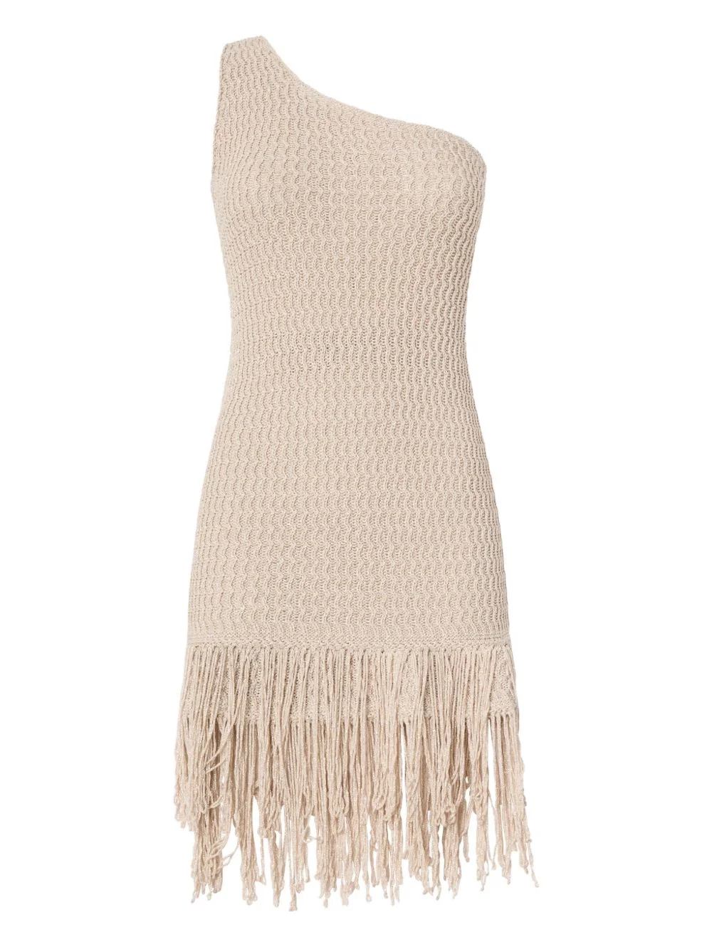 one-shoulder fringed-hem mini dress Highlights - Beige - Fringed hem - One-shoulder - Woven design - Sleeveless Made in Italy Composition Viscose 90%, Metallic Fibre 10% Washing instructions Hand Wash