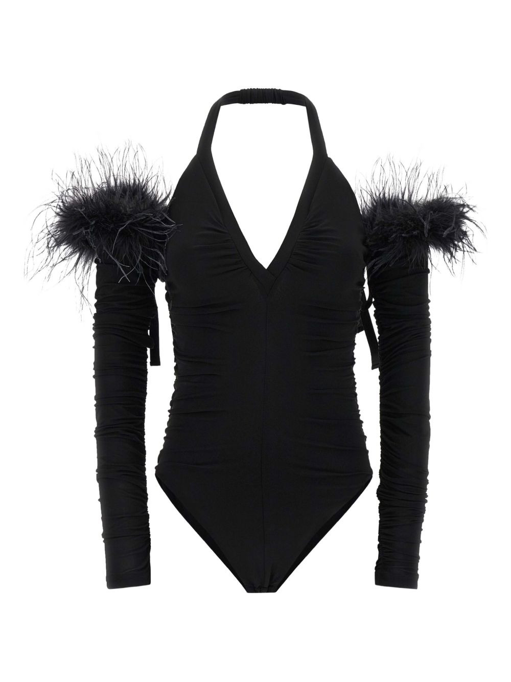 Ottovolante feather-trimmed halter bodysuit Highlights - Black - Feather shoulder embellishment - Grosgrain ribbon detail - Deep v-neck - Drawstring neck closure - Snap button fastening - Just a reminder that this piece must be tried on over your own garments. Imported Composition Viscose 94%, Elastane 6% Washing instructions Read Manufacturer Guidelines