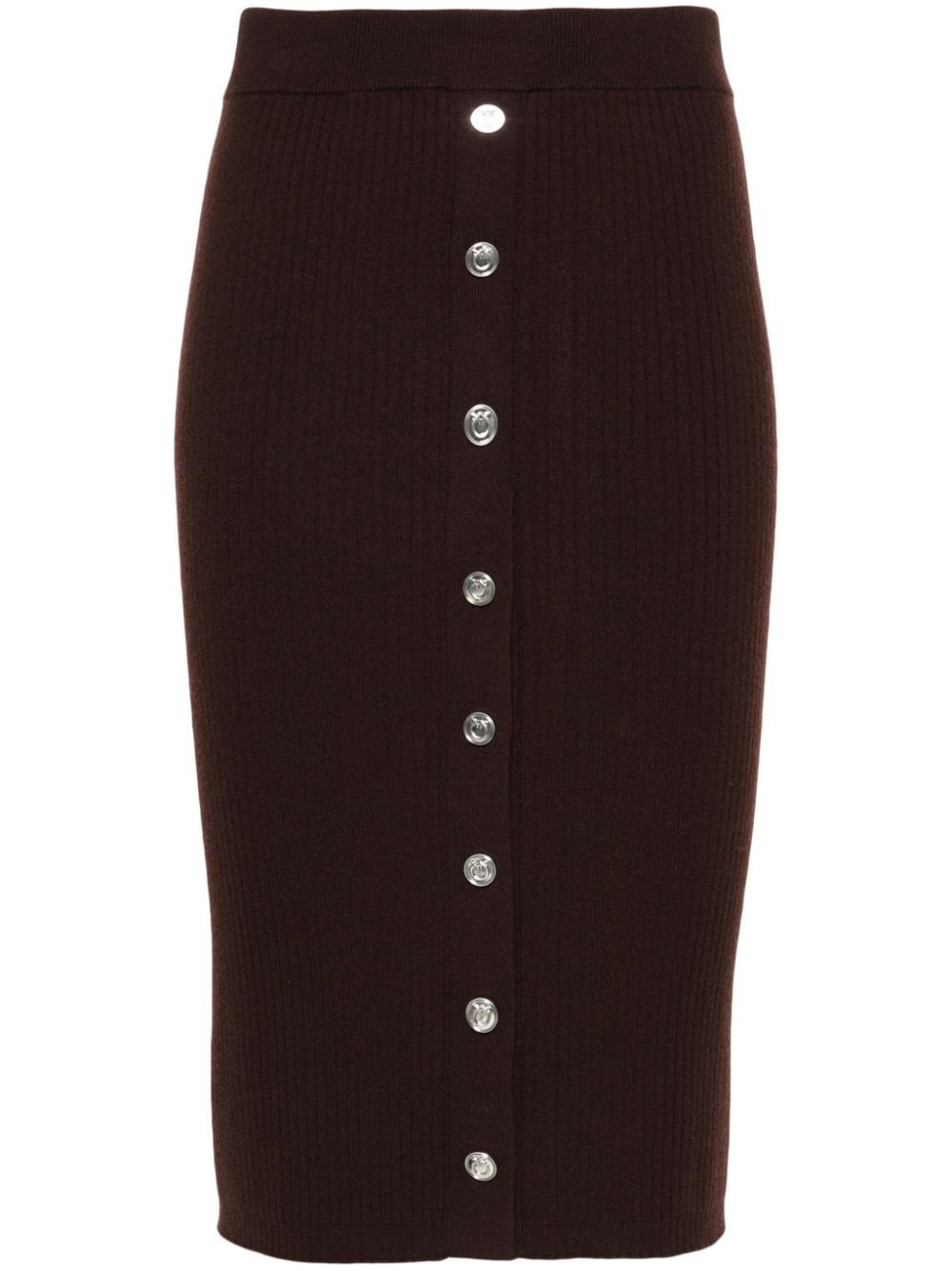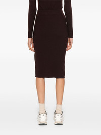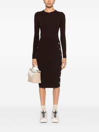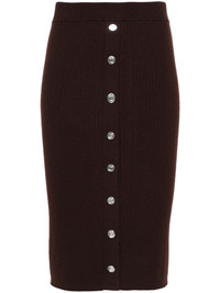 ribbed-knit midi skirt Highlights - Earth brown - Wool blend - Ribbed knit - Logo-embossed buttons - High-waisted - Elasticated waistband - Side press-stud fastening - Straight hem - Above-knee length Imported Composition Wool 75%, Polyamide 25% SIZE & FIT Model measurements Height 5 ft 9 in(1.76 m) Bust/Chest 31.88 in(81 cm) Hips 35.43 in(90 cm) Waist 24.8 in(63 cm) FittingInformation This midi-length skirt is intended to be worn high on the waist The elasticated waist allows for a comfortable fit Made with a midweight knit, this piece offers some stretch This piece fits true to size – take your usual size Washing instructions Hand Wash