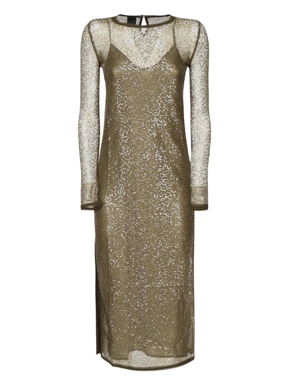 sequin-embellished mesh midi dress Highlights - Army green - Sequin embellishment - Mesh fabric - Long sleeves - Side slits - Slip dress Imported Composition Nylon 95%, Metallic Fibre 5% Washing instructions Read Manufacturer Guidelines