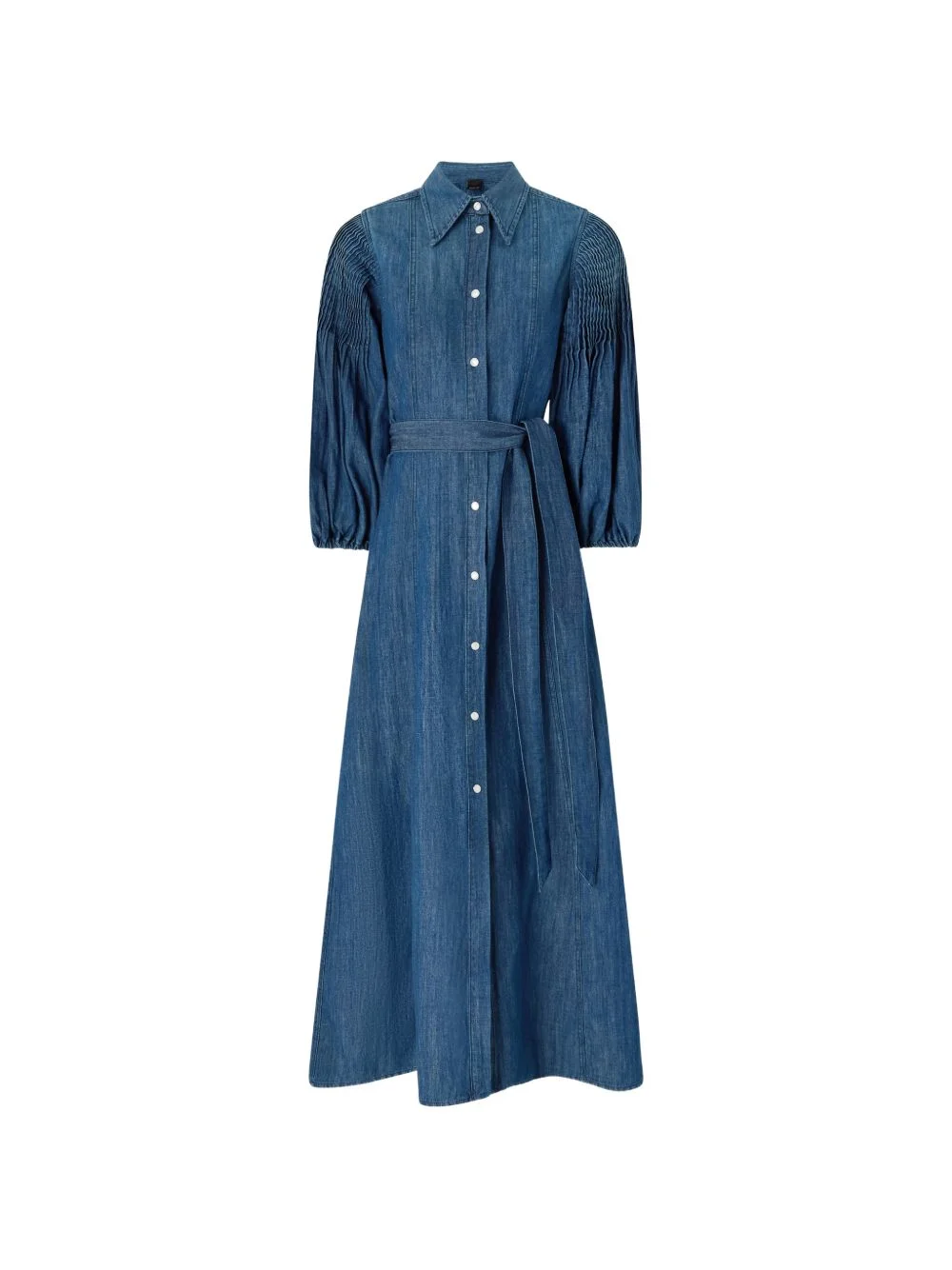 shirred belted denim dress