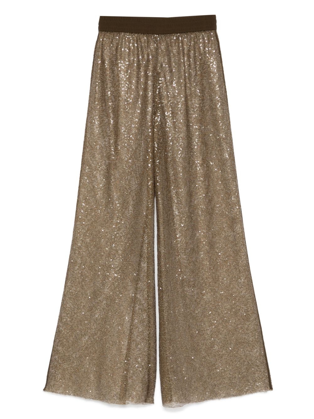 Swatch trousers Highlights - Olive green - Elasticated waistband - Partial lining - Sequin embellishment Imported Composition Polyester 100%, Nylon 95%, Metallic Fibre 5% SIZE & FIT Model measurements Height 5 ft 10 in(1.77 m) Bust/Chest 32.28 in(82 cm) Hips 35.03 in(89 cm) Waist 25.19 in(64 cm) FittingInformation Designed with a wide-leg cut, these trousers allow for a close fit at the waist and offer a loose and roomy fit over the leg The elasticated waist allows for a comfortable fit Made from a midweight non-stretch fabric