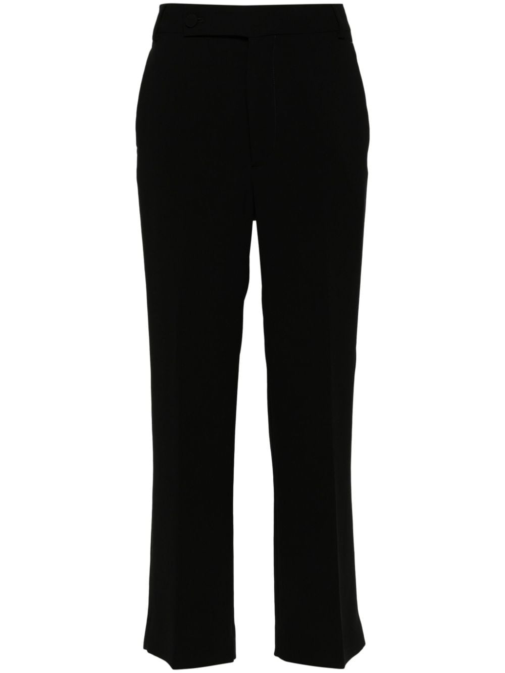 cady trousers Highlights - Black - Cady texture - Concealed front button, hook and zip fastening - Mid-rise - Belt loops - Two side slash pockets - Pressed crease - Dart detailing to the rear - Two rear button-fastening pockets - Cropped straight leg Made In Italy Composition Outer: Polyester 100% Lining: Cupro 100% SIZE & FIT Model measurements Height 5 ft 10 in(1.77 m) Bust/Chest 33.07 in(84 cm) Hips 37 in(94 cm) Waist 24.8 in(63 cm) FittingInformation Designed for a straight-leg fit, these trousers allow for a close fit at the waist and an unrestricted, comfortable fit over the leg Made from a midweight non-stretch fabric