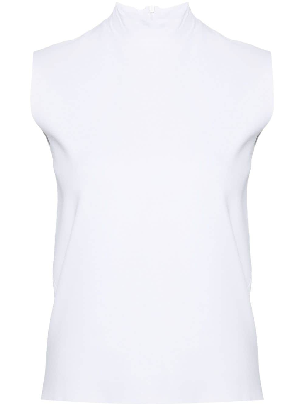 fine-knit mock-neck top Highlights - White - Fine knit - Stretch-design - Mock neck - Sleeveless - Concealed rear zip fastening - Raw-cut hem Made in Italy Composition Viscose 83%, Polyester 17% SIZE & FIT Model measurements Height 5 ft 11 in(1.8 m) Bust/Chest 32.67 in(83 cm) Hips 36.22 in(92 cm) Waist 24.4 in(62 cm) FittingInformation Designed for a slim fit that sits just away from the body offering a close yet comfortable fit Made with a midweight knit, this piece offers some stretch This piece fits true to size – take your usual size