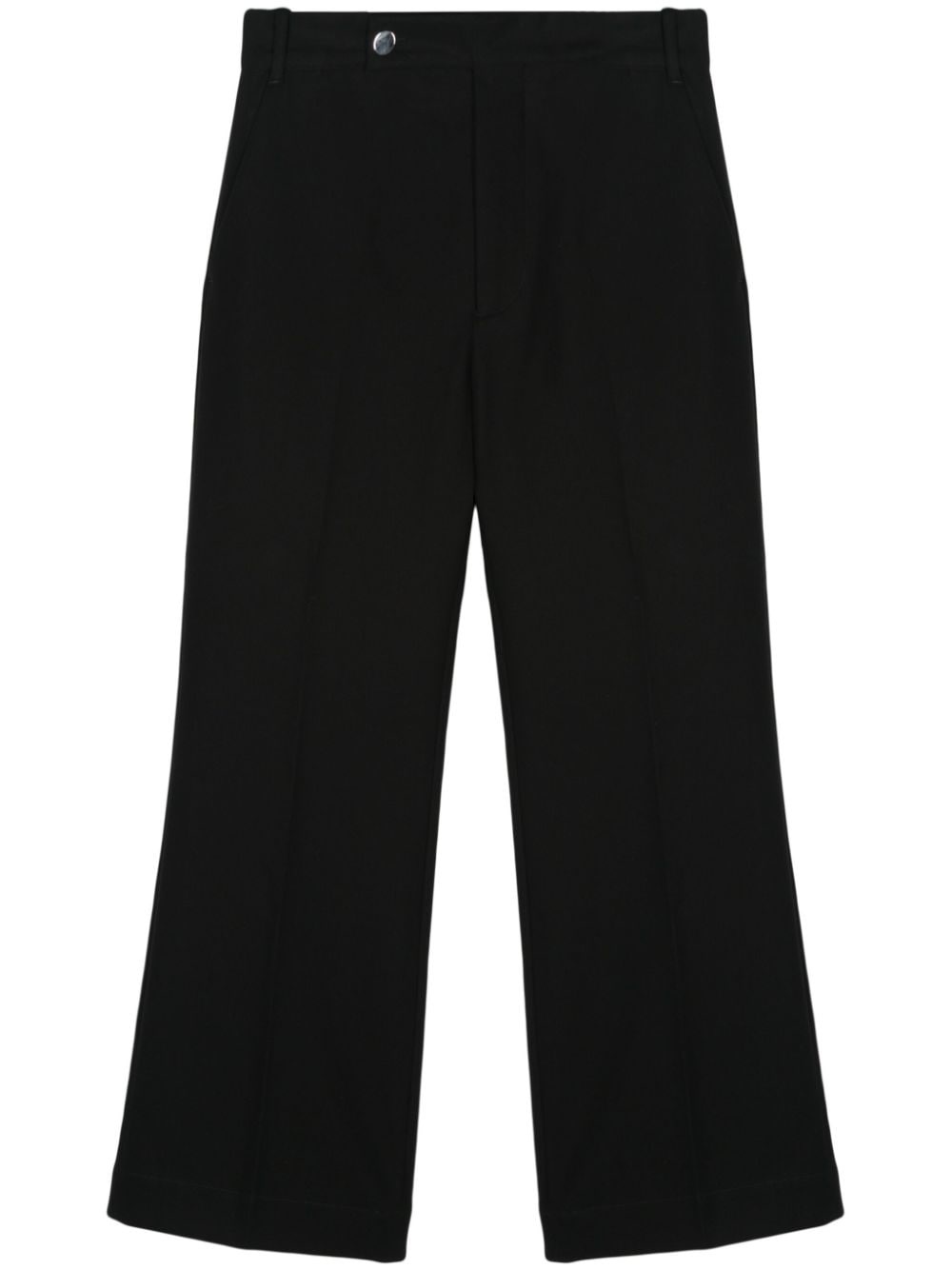 high-waisted flared trousers Highlights - Black - Cotton - Crepe texture - High-waisted - Belt loops - Two side slash pockets - Pressed crease - Two rear button-fastening pockets - Flared - Concealed front zip fastening - Off-centre front button fastening Made in Italy Composition Lining: Cotton 100% Outer: Cotton 100% Washing instructions Hand Wash