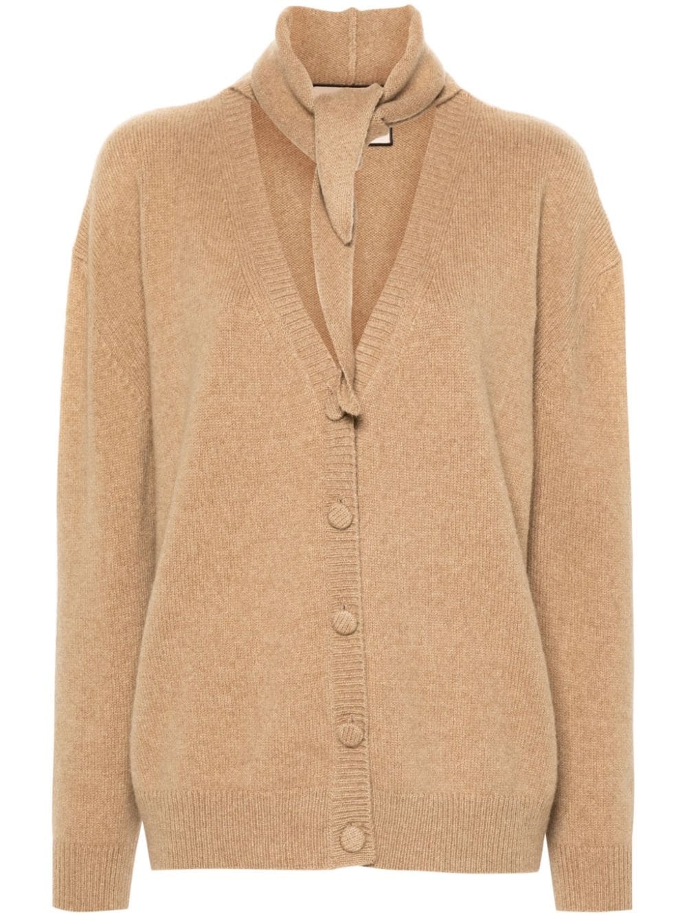 ribbed-knit cardigan Highlights - Camel brown - Merino wool blend - Ribbed knit - Front button fastening - V-neck - Drop shoulder - Long sleeves - Ribbed cuffs and hem - Draped panel detail - Straight hem Made in Italy Composition Merino 52%, Camel Hair 35%, Polyamide 13% SIZE & FIT Model measurements Height 5 ft 11 in(1.8 m) Bust/Chest 32.67 in(83 cm) Hips 35.82 in(91 cm) Waist 25.98 in(66 cm) FittingInformation Designed to be unstructured, offering a loose fit throughout Made with a midweight knit, this piece offers some stretch