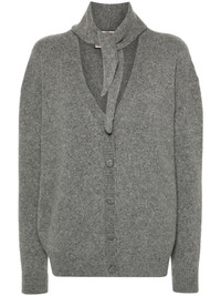 ribbed-knit cardigan Highlights - Medium grey - Merino wool blend - Ribbed knit - Melange effect - Front button fastening - V-neck - Drop shoulder - Long sleeves - Ribbed cuffs and hem - Draped panel detail - Straight hem Made in Italy Composition Merino 52%, Camel Hair 35%, Polyamide 13% SIZE & FIT Model measurements Height 5 ft 11 in(1.8 m) Bust/Chest 32.67 in(83 cm) Hips 35.82 in(91 cm) Waist 25.98 in(66 cm) FittingInformation Designed to be unstructured, offering a loose fit throughout Made with a midweight knit, this piece offers some stretch Washing instructions Hand Wash