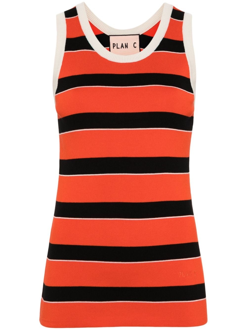 striped knitted top Highlights - Orange, black, ecru - Cotton - Horizontal stripe pattern - Round neck - Contrasting ribbed trims - Sleeveless - Tonal embroidered logo to the front - Straight hem - Pull-on style Made in Italy Composition Cotton 100% SIZE & FIT Model measurements Height 5 ft 9 in(1.76 m) Bust/Chest 31.88 in(81 cm) Hips 35.43 in(90 cm) Waist 22.44 in(57 cm) FittingInformation Designed for a slim fit that sits just away from the body offering a close yet comfortable fit Made with a midweight knit, this piece offers some stretch This piece fits true to size – take your usual size Washing instructions Hand Wash