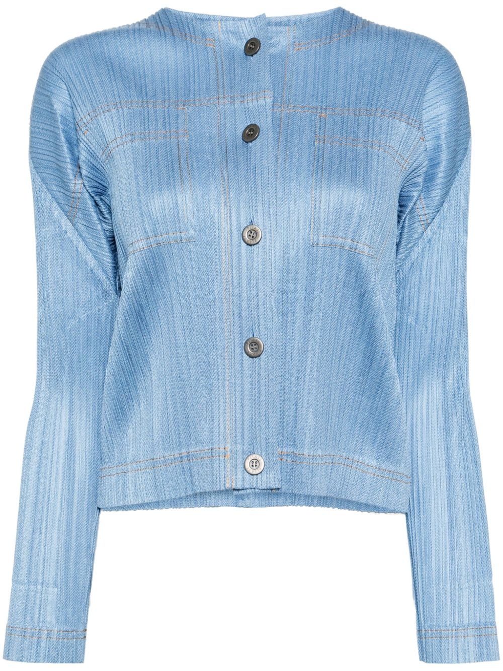 denim-like jacket Highlights - Light blue - Front button fastening - Two chest patch pockets Imported Composition Polyester 76%, Cotton 24% SIZE & FIT Model measurements Height 5 ft 9 in(1.76 m) Bust/Chest 31.1 in(79 cm) Hips 35.03 in(89 cm) Waist 24.4 in(62 cm) FittingInformation Designed for a slim fit that sits just away from the body offering a close yet comfortable fit The pleated construction on this piece allows for additional movement and flexibility in the fit