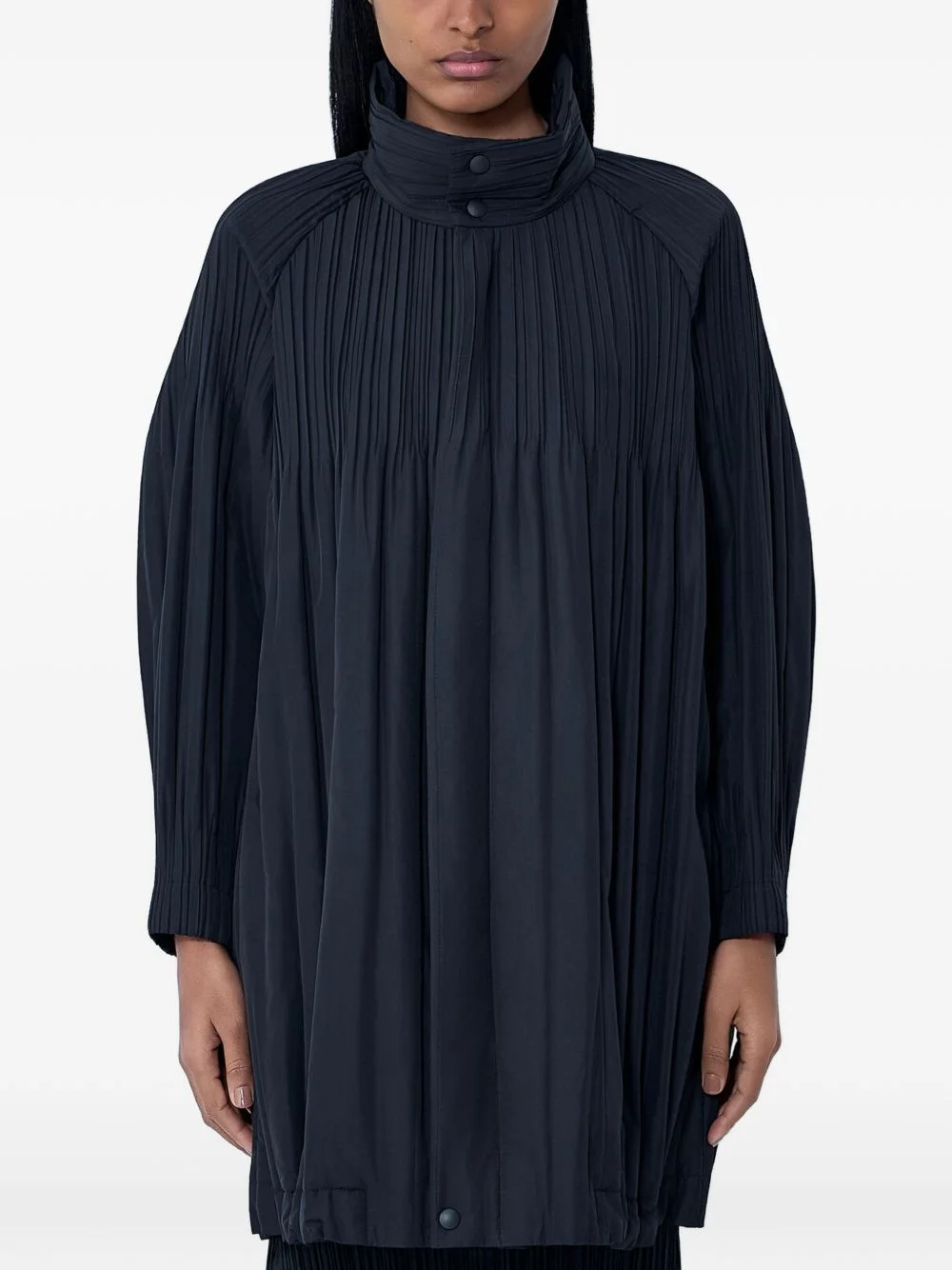high-neck pleated coat