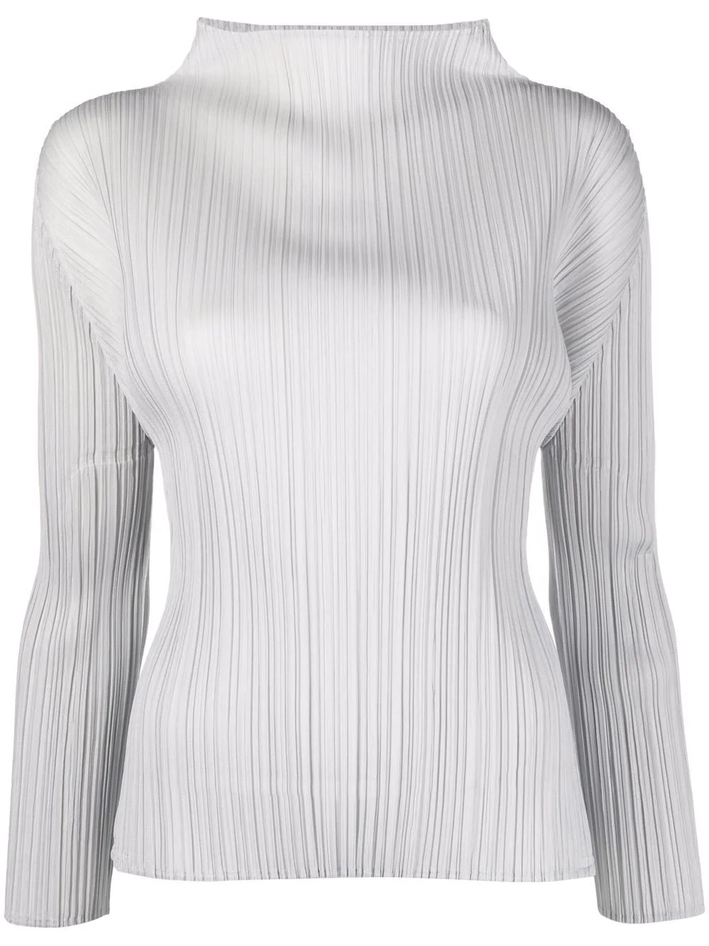 plisse-detail mock neck top light grey plisse details mock neck long sleeves straight hem Imported Composition Polyester 100% SIZE & FIT Model measurements Height 5 ft 11 in(1.8 m) Bust/Chest 31.88 in(81 cm) Hips 35.03 in(89 cm) Waist 24.01 in(61 cm) Washing instructions Machine Wash