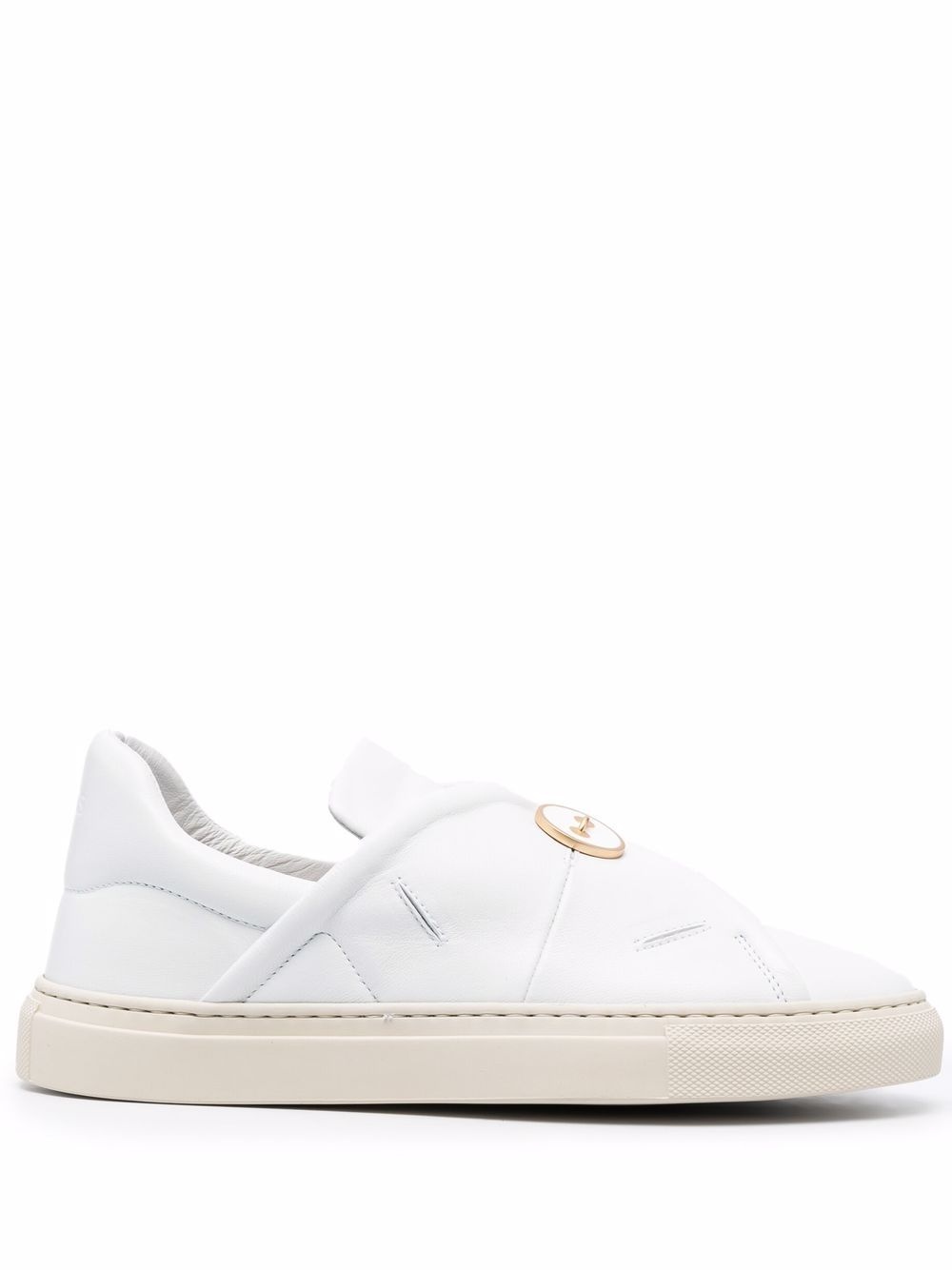 button-embossed slip-on sneakers Highlights - White - Vegan leather - Embossed gold-tone buttons - Tonal stitching - Round toe - Slip-on style - Flatform sole Made in Italy Composition Other fibres 100% SIZE & FIT Measurement HEEL 1.18 in(3 cm) Sole height 0.98 in(2.5 cm) Washing instructions Do Not Wash/Do Not Dry Clean
