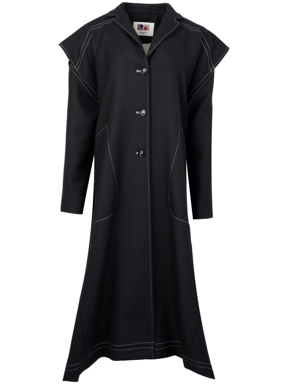 single-breasted trench coat Highlights - Black - Long sleeves - Contrast stitching - Front button fastening - Internal logo patch Imported Composition Polyester 58%, Wool 42%