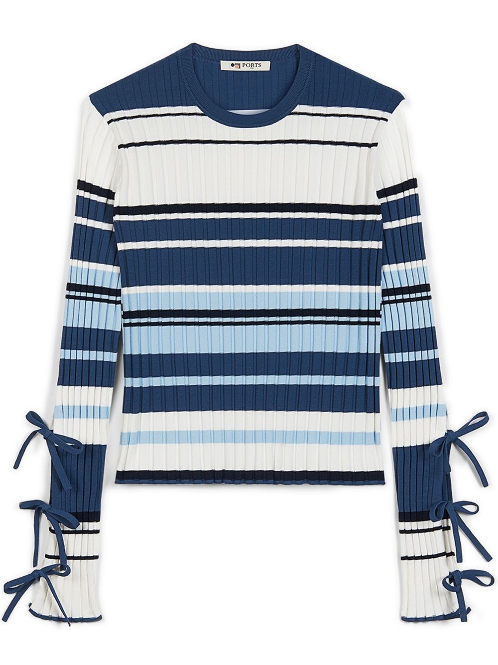 striped sweater Highlights - Blue - Bow detailing - Crew neck - Long sleeves - Straight hem Imported Composition Viscose 81%, Polyester 19%