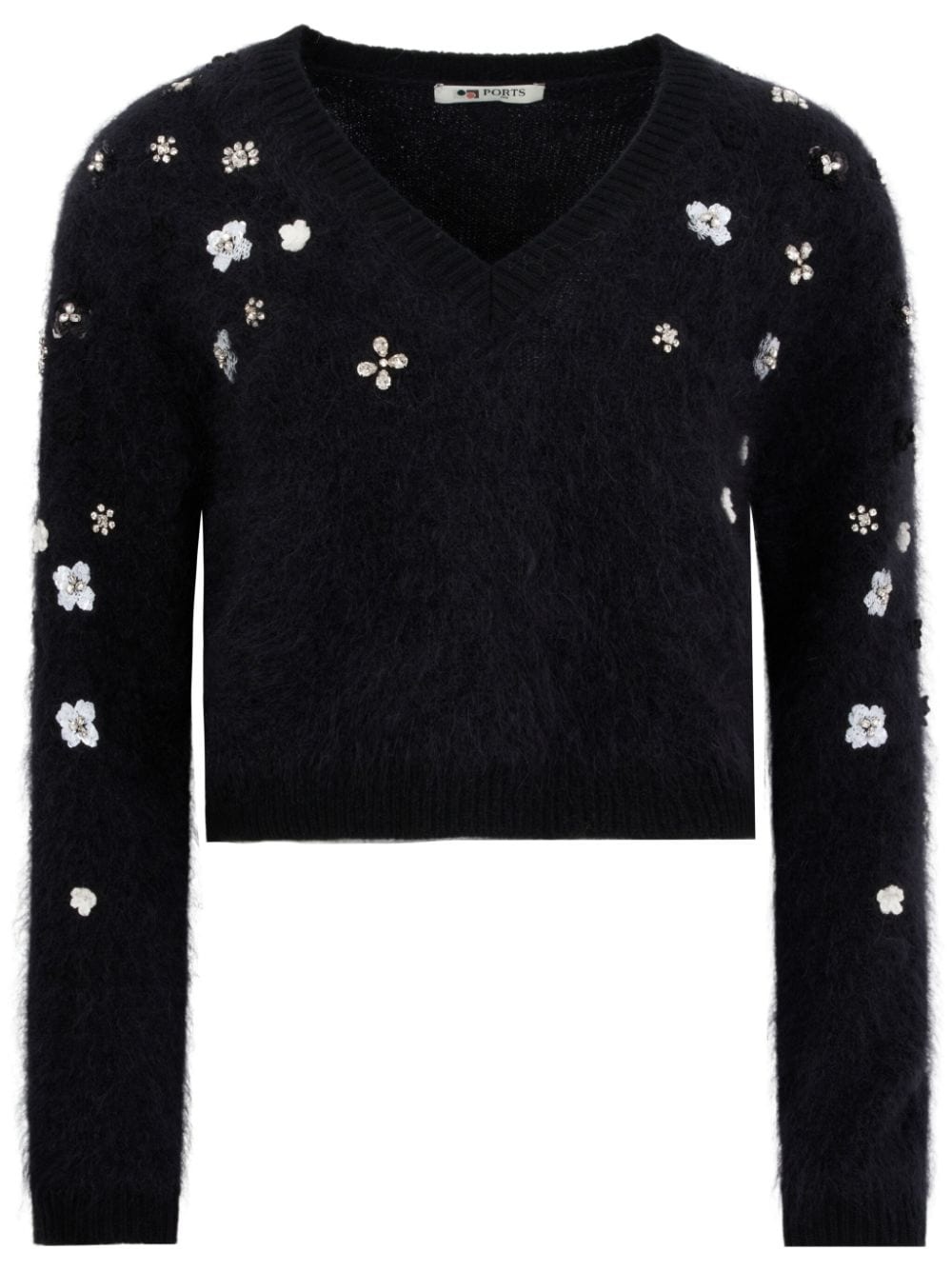 mohair-blend v-neck sweater Highlights - Black - Mohair blend - V-neck - Long sleeves - Floral applique - Ribbed cuffs and hem - Straight hem Imported Composition Mohair 74%, Silk 26%