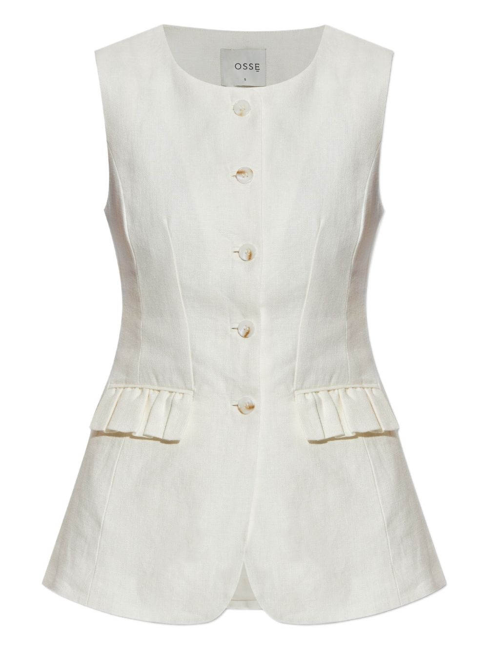 linen waistcoat Highlights - Ivory - Button front - Ruffled trim pockets - Sleeveless design Imported Composition Linen/Flax 100%
