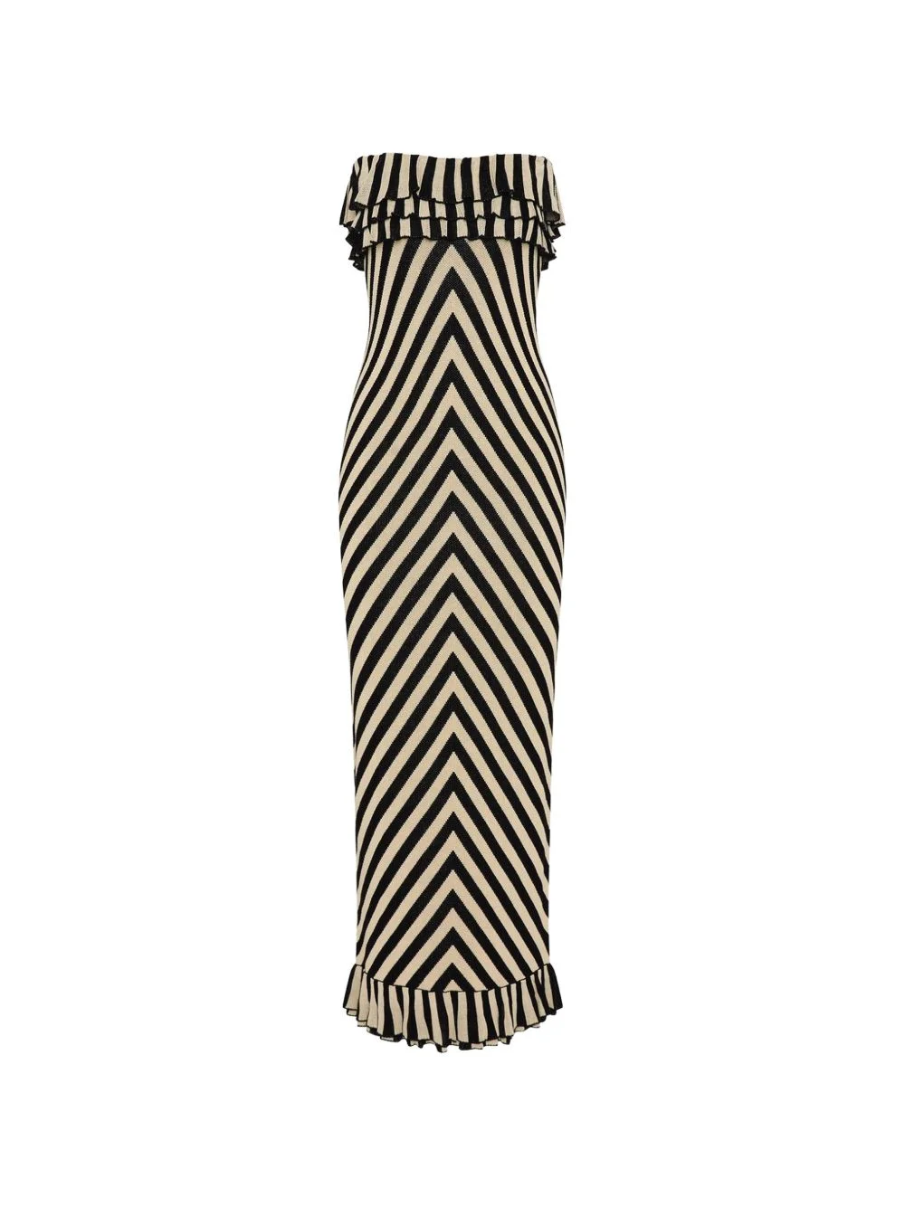 ruffled-detail striped-pattern strapless maxi dress Highlights - Beige and black - Chevron stripe - Ruffle trim - Strapless - Fitted silhouette - Floor-length Imported Composition Viscose 100% Washing instructions Read Manufacturer Guidelines