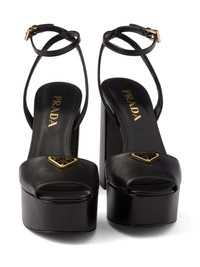 115mm leather platform sandals Highlights - Black - Nappa leather - Enamel triangle logo - Gold-tone hardware - Square open toe - Buckle-fastening ankle strap - 115mm block heel - Branded leather insole - Platform sole Composition Lining: Leather 100% Sole: Rubber 100%, Leather 100% Outer: Nappa Leather 100% SIZE & FIT Measurement HEEL 4.52 in(11.5 cm) Sole height 1.57 in(4 cm)