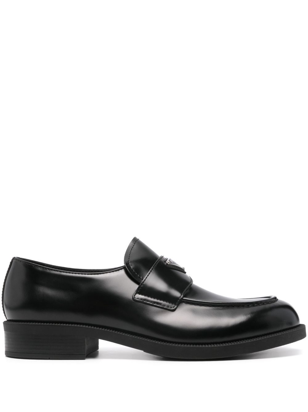 50mm Chocolate loafers Highlights - Black - Calf leather - Smooth grain - Enamel triangle logo - Slip-on style - Round toe - Branded leather insole - 50mm block heel - Rubber sole Composition Outer: Calf Leather 100% Sole: Rubber 100% Lining: Calf Leather 100% SIZE & FIT Measurement HEEL 1.29 in(3.3 cm)