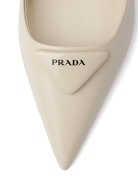75mm Saffiano leather slingback pumps Highlights - White - Saffiano leather - Patent finish - Logo patch to the front - Pointed toe - Slingback strap - High stiletto heel Composition Outer: Patent Leather 100% Lining: Calf Leather 100% Sole: Leather 100% SIZE & FIT Measurement HEEL 2.95 in(7.5 cm)