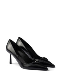 75mm triangle-logo leather pumps Prada's signature minimalist design style and use of a monochromatic palette is showcased on this pair of pumps from the AW22 collection, which feature a two-tone logo patch at the front and sleek, pointed-toe silhouette. Highlights - 75mm - Black - Leather sole - Metal lettering logo - Screen-printed triangle logo Composition Sole: Leather 100% Lining: Calf Leather 100% Outer: Patent Calf Leather 100% SIZE & FIT Measurement HEEL 2.95 in(7.5 cm)